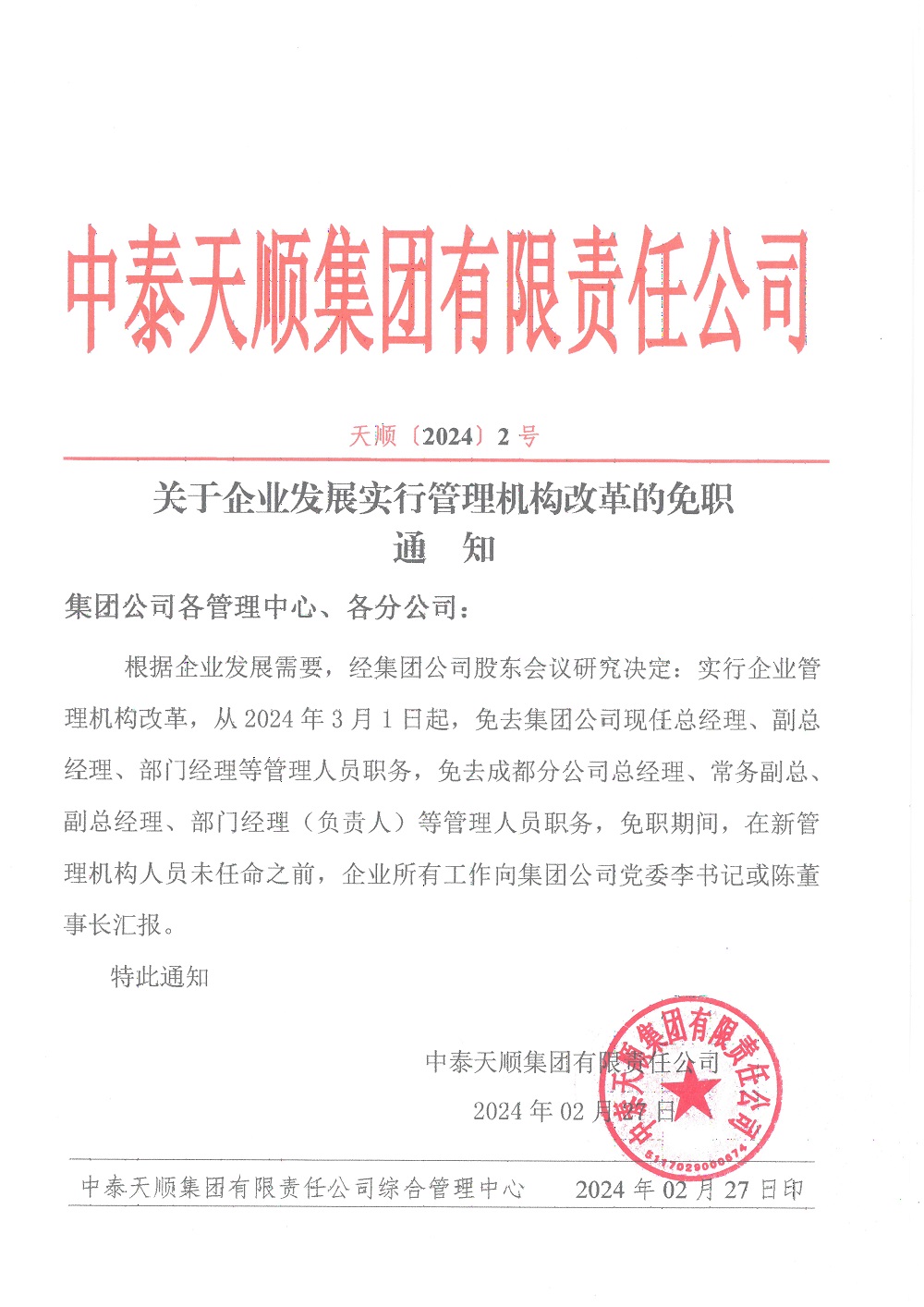 關(guān)于企業(yè)發(fā)展實(shí)行管理機(jī)構(gòu)改革的免職通知