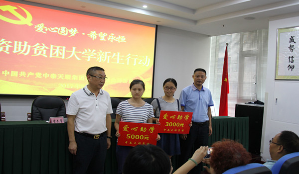 ——中泰天順集團資助困難大學新生行動2017年8月24日下午,中泰天順集團公司黨委在公司多功能活動室舉行“愛心助學金發放儀式”,為兩名困難大學新生發放了8000元愛心助學金,幫助他們實現讀書夢、大學夢...