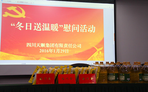 春節將至,歲寒情深。2016年1月29日上午,四川天順集團有限責任公司在公司會議室開展了“冬日送溫暖”慰問活動,為張鑫等12名困難黨員、員工分別送上價值350元的大米、食用油和500元慰問金,在這個寒冬季節里帶給他們一絲別樣的暖意。公司領導與他們親切交談,噓寒問暖,拉家常、送祝福,洋溢著祥和、溫暖氣息,使困難員工們深深地感受到來自天順大家庭的融融暖意。通過慰問活動,公司領導與員工拉近了彼此的距離,營造了濃濃的節日氛圍。困難員工們對公司領導在百忙之中仍然記掛著他們的冷暖表示衷心感謝!一致表示將在今后的生活、工作中克服困難,更加積極面對生活,繼續努力工作,為公司的發展壯大貢獻力量。